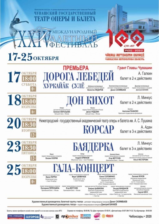 ✅ 17 октября. Праздник хореографического искусства откроется премьерой национального балета «Дорога лебедей». Музыку к спектаклю, созданному по мотивам народных сказок и легенд, пишет современный чувашский композитор Андрей Галкин, знакомый чебоксарцам как автор последней балетной премьеры театра – балета «Атилла. Рождение легенды», признанного по итогам Республиканского конкурса «Узорчатый занавес-2019» лучшим спектаклем года и уже показанного в Самаре на V Всероссийском фестивале «Волжские театральные сезоны». Начало в 18:00. Стоимость билетов: от 600 до 1500 рублей.
